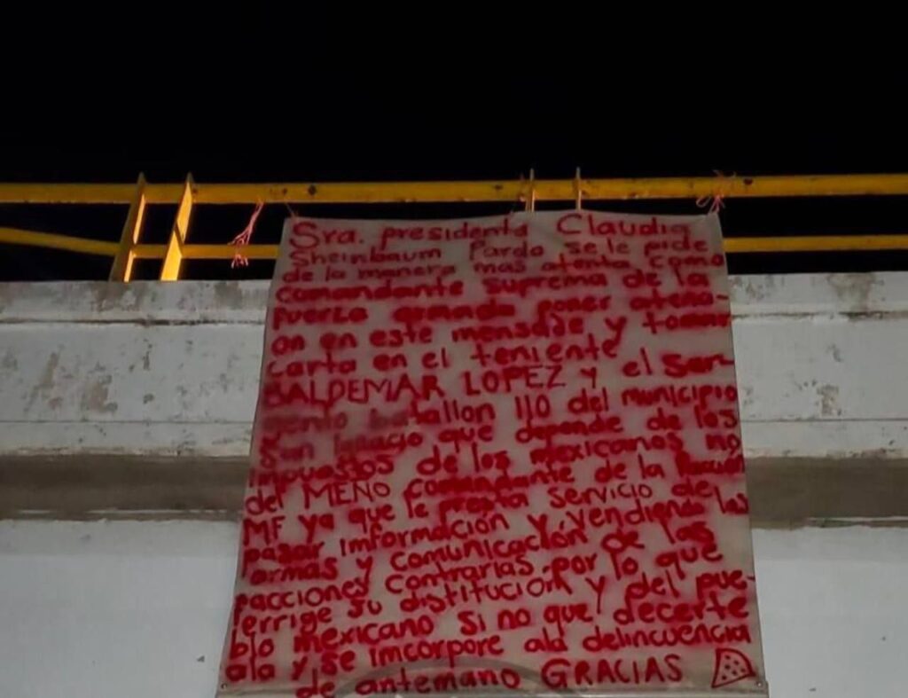 Según medios locales, las mantas aparecieron el 13 de enero en La Cruz, Elota. Dos fueron colocadas en la entrada de la comunidad y una en un puente. El mensaje, firmado por la facción del Cártel de Sinaloa liderada por los hijos de Joaquín ‘El Chapo’ Guzmán, instaba a Sheinbaum a investigar a dos miembros del Ejército Mexicano en San Ignacio por sus supuestos vínculos con La Mayiza, con quienes mantienen un conflicto armado desde septiembre de 2024.
