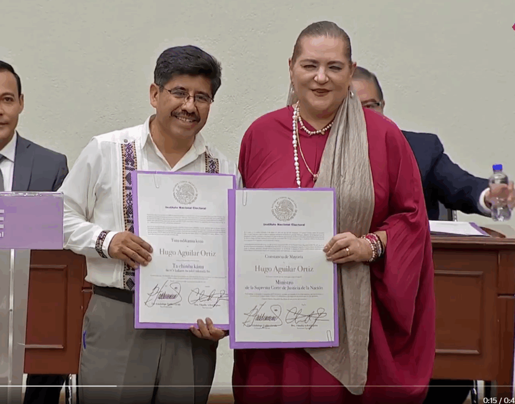 Entre los momentos más emotivos estuvo la entrega de la constancia a Hugo Aguilar, quien no solo obtuvo la votación más alta, sino que recibió el documento en español y mixteco, su lengua materna. Claudia Espino, secretaria ejecutiva del INE, le dirigió palabras en rarámuri: “Hoy un hermano indígena asume la gran responsabilidad de ser guía y mando”. Aguilar, en un discurso bilingüe, prometió una justicia sin corrupción, nepotismo ni clasismo.