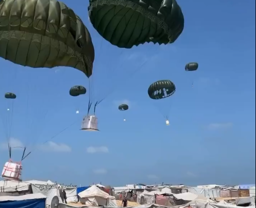 FRANJA DE GAZA.- En una imagen que encapsula la desesperación y la contradicción de la crisis humanitaria, medios palestinos han difundido impactantes fotografías y videos que muestran cómo la ayuda humanitaria, tan urgentemente necesaria, es arrojada desde el aire directamente sobre los precarios campamentos de tiendas de campaña que albergan a decenas de miles de desplazados en el sur de la Franja de Gaza.