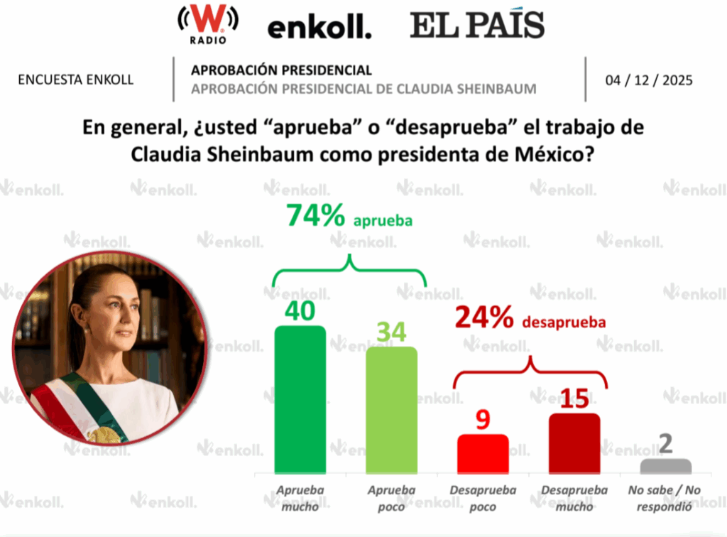 La mención específica a la encuesta de Enkoll no fue casual. Rodríguez la presentó como “el ejercicio demoscópico que mejor resultado le ha dado a la mandataria federal hasta ahora”, elevándola por encima de otros sondeos que, si bien también la colocan por encima del 70%, no alcanzan ese pico del 74%. Este gesto buscaba no solo celebrar un número alto, sino también validar una fuente particular que confirma la narrativa oficial de un gobierno sólidamente respaldado.