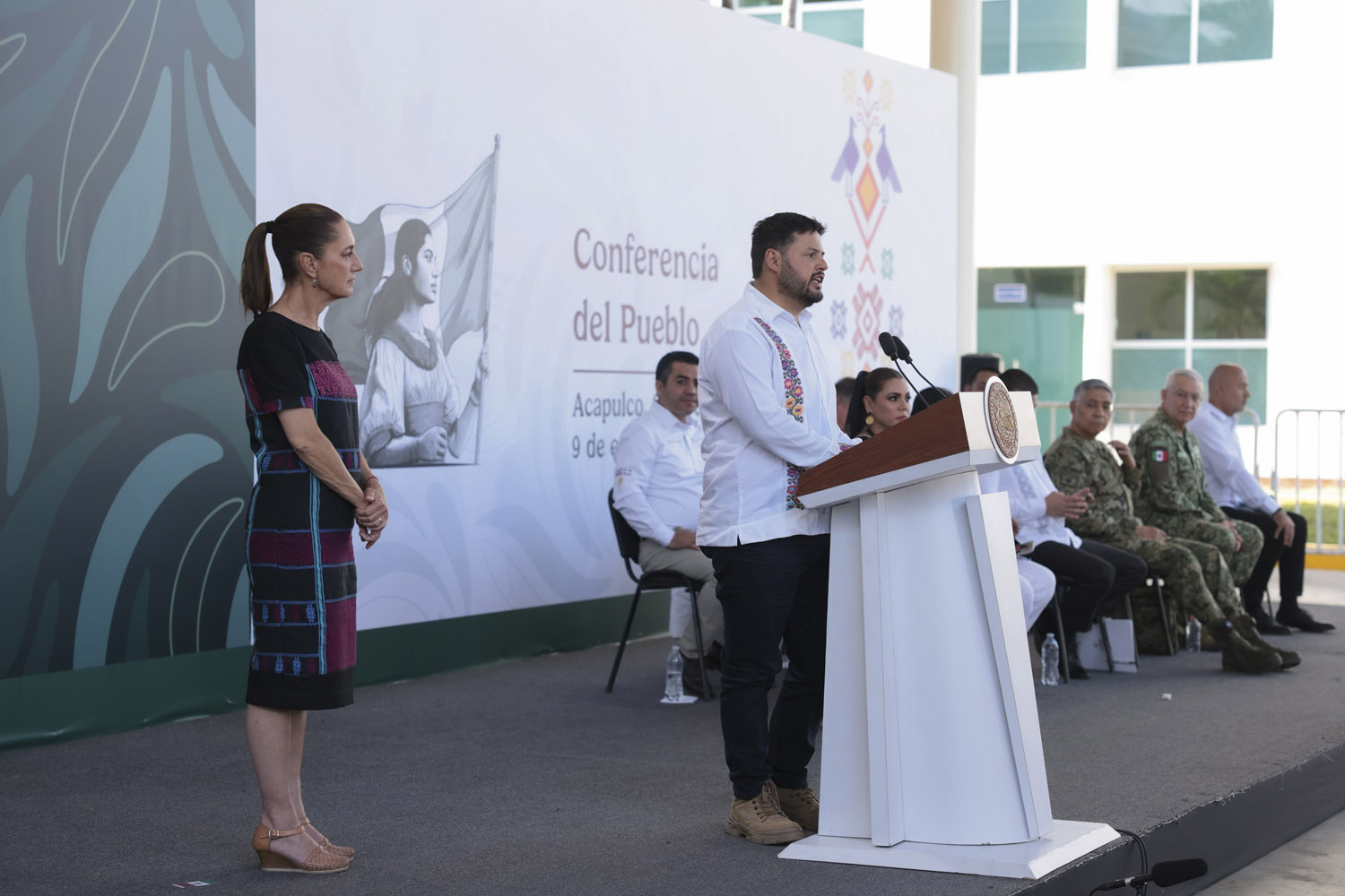 Acapulco, Guerrero, México, 9 de enero de 2026. La doctora Claudia Sheinbaum Pardo, presidenta Constitucional de los Estados Unidos Mexicanos en conferencia de prensa matutina, “Conferencia del Pueblo” desde Guerrero. La acompañan Evelyn Cecia Salgado Pineda, gobernadora Constitucional del Estado de Guerrero; Efraín Morales López, director general de la Comisión Nacional del Agua (Conagua); Rosa Icela Rodríguez Velázquez, secretaria de Gobernación; Marcela Figueroa Franco, secretaria ejecutiva del Sistema Nacional de Seguridad Pública (SESNSP); Omar García Harfuch, secretario de Seguridad y Protección Ciudadana (SSPC); Hernán Cortés Hernández, comandante de la Guardia Nacional (GN); Raymundo Pedro Morales Ángeles, secretario de Marina (Semar); Sebastián Ramírez Mendoza, director general del Fondo Nacional de Fomento al Turismo (Fonatur); Ricardo Trevilla Trejo, secretario de la Defensa Nacional (Sedena); Bulmaro Juárez Pérez, divulgador de lenguas originarias, presentador de la sección “Suave Patria” y Jesús Antonio Esteva Medina, secretario de Infraestructura, Comunicaciones y Transportes. Foto: Gabriel Monroy / Presidencia