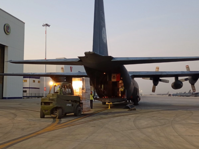 Los dos primeros vuelos partieron el jueves, también en aeronaves Hércules, cargando lo esencial para la emergencia: 5,400 litros de agua purificada, cascos de seguridad, linternas, chalecos reflectantes, bombas fumigadoras, palas, picos, carretillas, catres plegables, colchonetas, baterías, sillas de ruedas, kits de oxígeno y botiquines de primeros auxilios. Cada artículo fue seleccionado con precisión para responder a las necesidades inmediatas de supervivencia, saneamiento y movilidad en zonas devastadas.