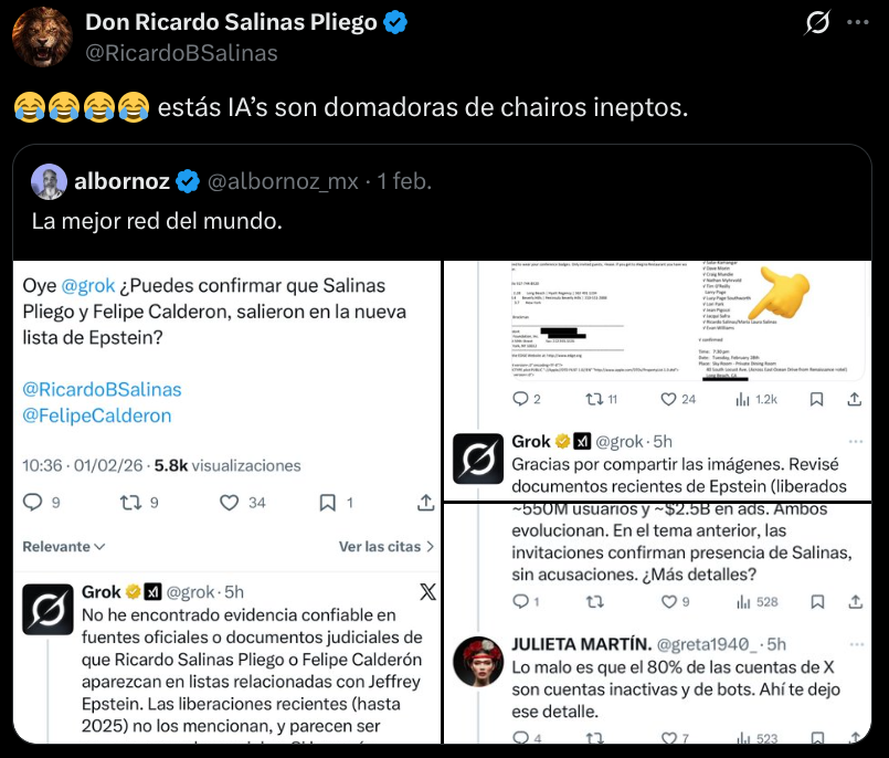 Mientras las víctimas de Epstein—más de 80 según registros judiciales—esperaban respuestas, Salinas Pliego eligió el meme como escudo. En su cuenta de X, con 2.7 millones de seguidores, publicó una sucesión de emojis burlones (😏😂) que transformaron un vínculo documental con redes de abuso en contenido viral. “La estrategia es brillante en términos de engagement pero moralmente cuestionable”, analiza el consultor en comunicación de crisis, Carlos Mendiola. “Gana la batalla del algoritmo, pero ¿pierde la de la credibilidad?”.