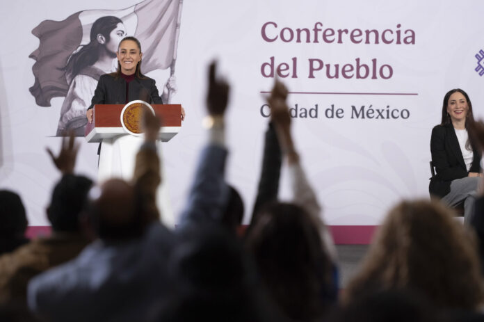 Cuauhtémoc, Ciudad de México, México, 13 de febrero de 2026. La doctora Claudia Sheinbaum Pardo, presidenta Constitucional de los Estados Unidos Mexicanos en conferencia de prensa matutina, “Conferencia del Pueblo” en el Salón Tesorería de Palacio Nacional. La acompañan Claudia Curiel de Icaza, secretaria de Cultura; Karina Lujan Lujan, directora general del Instituto Nacional del Derecho de Autor (INDAUTOR); Daniela Alatorre Benard, directora general del Instituto Mexicano de Cinematografía (IMCINE); Bulmaro Juárez Pérez, divulgador de lenguas originarias, presentador de la sección “Suave Patria”. Foto: Saúl López / Presidencia